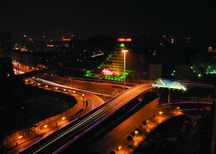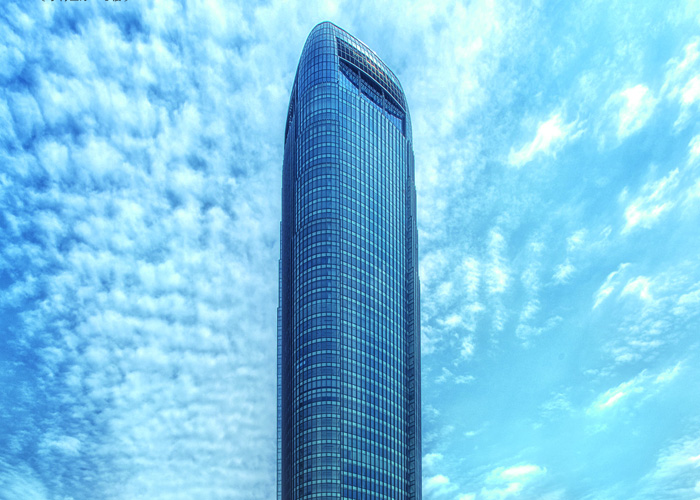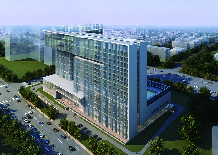 東景五星級酒店及辦公樓項目位于貴陽市觀山湖區(qū),基地東鄰貴陽市行政中心,北鄰鋁鎂設計院,南鄰貴州移動指揮調度中心,西向陽森房產,地塊基本呈矩形,項目總用地面積24966平方米,總建筑面積99284平方米,其中地下建筑面積41915平方米。地上建筑面積共57369平方米,地下部分共計4層,為停車庫及酒店配套用房。地上部分由一棟結構總高64.4m的14層辦公樓和一棟結構總高68.8m的16層酒店組成,兩棟塔樓平面呈L型布置,結構形式均為現(xiàn)澆框架剪力墻結構,辦公樓頂部采用鋼結構向外懸挑兩層,懸挑跨度為11.1m。辦公樓和酒店在頂部通過跨度為30m鋼結構連接體相連,連接體在辦公樓側與混凝土柱鉸接相連,在酒店一側用滑移支座相連,滑移支座接罕遇地震下兩座單體最不利彈性位移進行設計,保證兩個單體在罕遇地震下不致相撞或脫開。