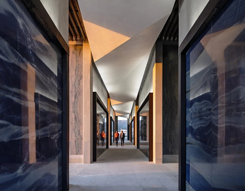 公墓分層設(shè)立的陽(yáng)臺(tái)、庭院和梯田式花園從建筑向外延伸,提供眺望點(diǎn)、寬敞的座位以及一個(gè)適合沉思的空間。