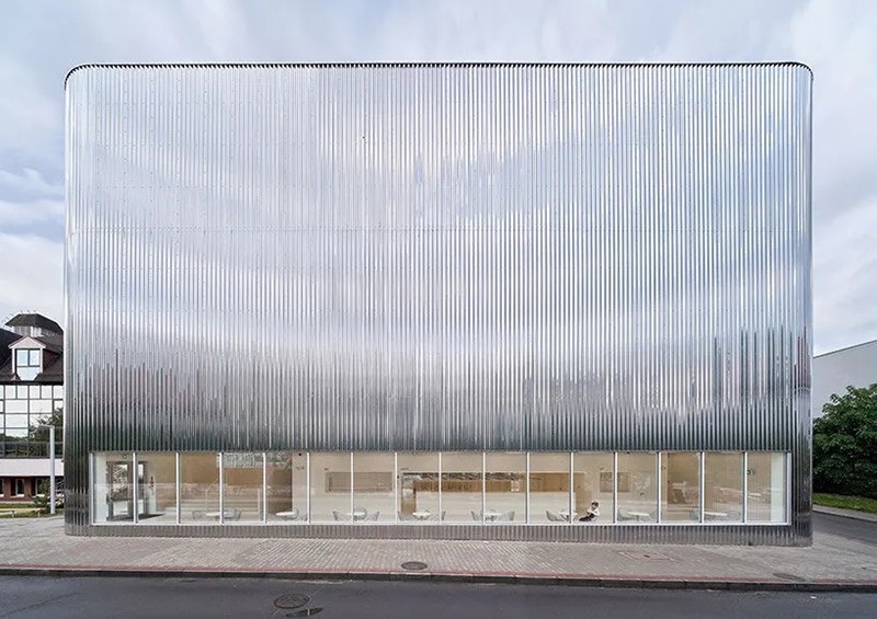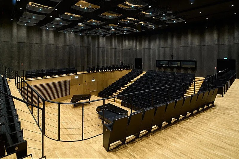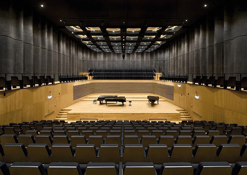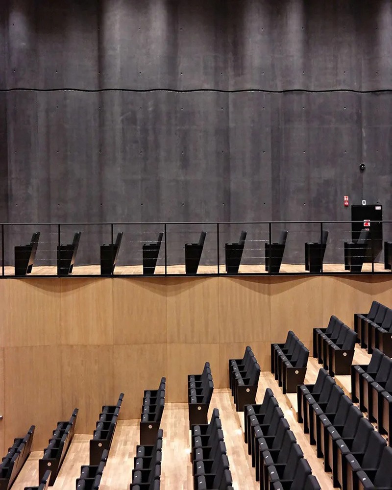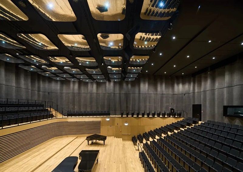 SLAS Architekci 選擇混凝土作為音樂(lè)廳結(jié)構(gòu)、聲學(xué)和美學(xué)屬性的主要材料。通過(guò)讓鋼筋混凝土墻暴露在外,并以釉面漆進(jìn)行裝飾,從而無(wú)需額外的聲學(xué)覆層。音樂(lè)廳內(nèi)部采用聲學(xué)優(yōu)化的波浪圖案,這一設(shè)計(jì)元素也延伸至鋼制外觀上。這不僅增強(qiáng)了聲音的擴(kuò)散,還在建筑的內(nèi)外之間創(chuàng)造了視覺連續(xù)性。鋼制外觀的反射特性有助于建筑與周圍環(huán)境的融合,而其耐久性則確保了建筑能夠抵御破壞和時(shí)間的考驗(yàn)。