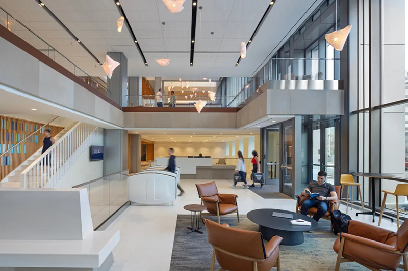 羅伯特-A-M-斯特恩建筑設(shè)計事務(wù)所(RAMSA)為位于華盛頓市中心喬治敦大學(xué)國會大廈校區(qū)的麥考特公共政策學(xué)院設(shè)計了一座新的旗艦建筑。這座新建筑占地 150,000 平方英尺,位于西北部 125 E 街,是學(xué)生、教師、研究人員以及活躍在美國首都的廣大決策社區(qū)的學(xué)術(shù)中心。大樓內(nèi)有大量的教育和社區(qū)空間,包括 20 間教室、一個寬敞的主公共空間、學(xué)術(shù)辦公室、一個可容納 400 人的禮堂,以及一個可俯瞰美國國會大廈全景的大型屋頂露臺和一個可容納 280 人的會場。作為一個致力于應(yīng)對復(fù)雜的國家和國際挑戰(zhàn)的學(xué)術(shù)中心,麥考特公共政策學(xué)院將可持續(xù)發(fā)展和能源效率放在首位,其設(shè)計目標(biāo)是獲得 LEED 白金級認(rèn)證。此外,由建筑師、設(shè)計師、藝術(shù)家和雕塑家瑪雅-林(Maya Lin)設(shè)計的一系列針對特定場所的原創(chuàng)裝置,鼓勵建筑使用者考慮周圍的自然環(huán)境。作為國會大廈校區(qū)的旗艦建筑,麥考特學(xué)校是喬治城市中心文脈和連貫性的延伸。125 E St.是一座由石材、鑲板金屬和玻璃幕墻組成的立方體建筑,其外形和規(guī)模與周邊建筑一脈相承。垂直鰭片和磚砌底板--主要用于遮擋陽光并優(yōu)化熱性能--用凸出的線條勾勒出建筑的立面,與鄰近的西北第一街 500 號的統(tǒng)一沖孔窗戶遙相呼應(yīng)。然而,麥考特學(xué)院的 125 E St. 建筑則通過金屬、石材和玻璃的交錯使用,引入了新的視覺趣味。麥考特公共政策學(xué)院的內(nèi)部建筑是由其獨特的地理位置所提供的教育機會所決定的,即靠近美國國會大廈和最高法院等國家主要決策機構(gòu)??扇菁{ 400 人的禮堂具有廣播功能,屋頂場地可容納 280 人,可接待主要的政策制定者和從業(yè)人員,進行與國家和國際政策制定相關(guān)的重要討論。大樓的設(shè)計提倡有機互動和偶遇,以促進形成一個強大、互聯(lián)和包容的學(xué)術(shù)社區(qū)。瑪雅-林工作室(Maya Lin Studio)的一系列裝置作品名為 “映射我們在世界上的位置”(Mapping Our Place in the World),為室內(nèi)空間增添了活力,使居住者置身其中,促使他們思考自己與更廣闊世界的聯(lián)系?!安ㄍ旭R克河沿岸 "是一個安裝在天花板上的玻璃大理石作品,仿佛鳥瞰波托馬克河流域。在主公共區(qū),一系列名為 “是否有鳥 ”的天氣響應(yīng)吊燈會根據(jù)陽光、云朵、雪或雨的存在而改變顏色。當(dāng)?shù)厮?、濕地、森林和草地在一天和一年中不同時間的錄音,通過主樓梯上方的定向揚聲器播放。林還參與了建筑屋頂景觀的設(shè)計。“空中花園 "是一個帶有橢圓形水池和本地植物的室外露臺。它為人們提供了安靜交談和休憩的機會,同時還弘揚了地區(qū)生態(tài),并將美國國會大廈的美景盡收眼底。
