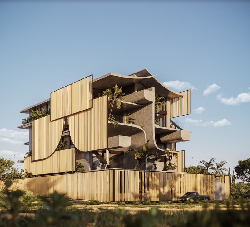 屋頂呈波浪狀起伏,這不僅為建筑增添了獨特的建筑特色,還反映了自然形態(tài),其靈感源自海浪和連綿起伏的地貌。對天然材料的重視、綠植的融入以及有機的形態(tài),都體現(xiàn)了親生物的設計理念。這種設計哲學旨在讓居住者更緊密地與自然相連,促進身心健康和可持續(xù)發(fā)展。木質(zhì)板條的使用以及開放、通風的設計,顯示出受到了熱帶建筑風格的影響,熱帶建筑常常會融入一些元素來散熱和增強通風效果。
